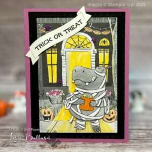 This little mummy hippo absolutely steals the show! 🍬 I love how it pairs with the glowing yellow porch and classic Halloween elements. The playful mix of Petunia Pop, Basic Black, and Pumpkin Pie gives the whole card a cheerful yet slightly spooky vibe—perfect for sending Halloween greetings.